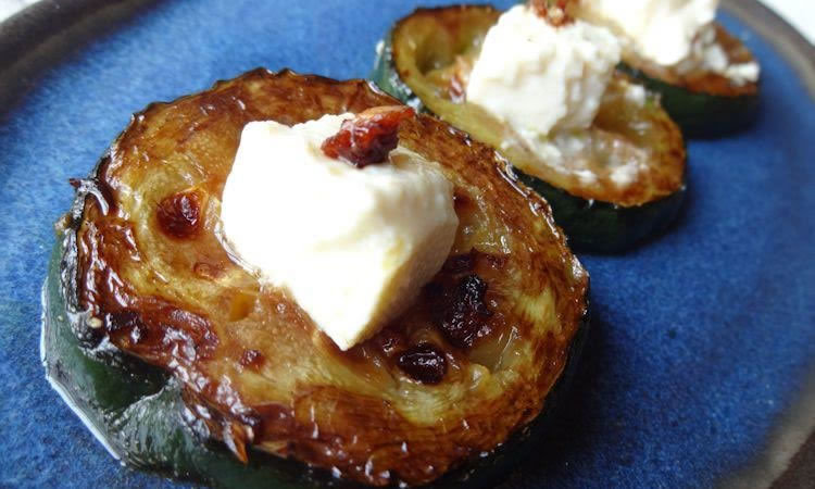 ズッキーニをこんがりと焼いて、塩麹に漬けこんだ豆腐で作ったチーズをのせます。