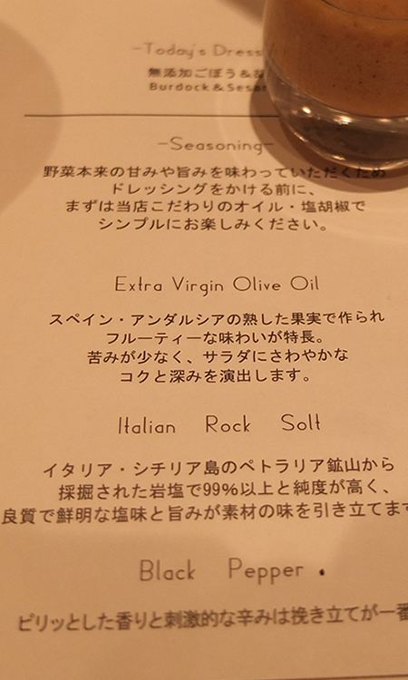まずは塩胡椒とオイルだけで野菜の味を楽しんでから、ドレッシングをかけるそうです!
