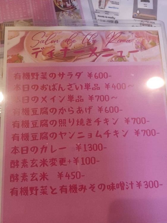 今回私は火曜日のお食事【Salon de the Rima】に18時予約で行き、3種盛りできんぴら・大根のジュノベーゼ・梅酢カブ、後は豆腐コロッケも頂きました。どれも美味しかった!