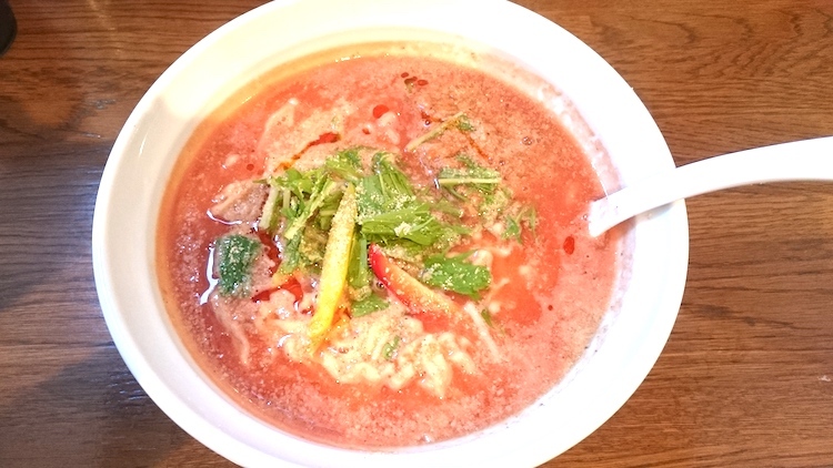 食べる前はトマトソースの様なイタリアン的な味かと思っていましたが、スープはタンタンメンと味噌ラーメン中間の様な感じでトマトの酸味等は殆ど感じませんでした。